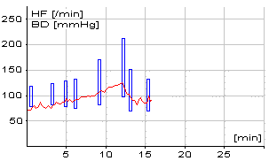 Baloldalt az első grafikon a szívritmus és vérnyomás alakulását ábrázolja az idő függvényében,